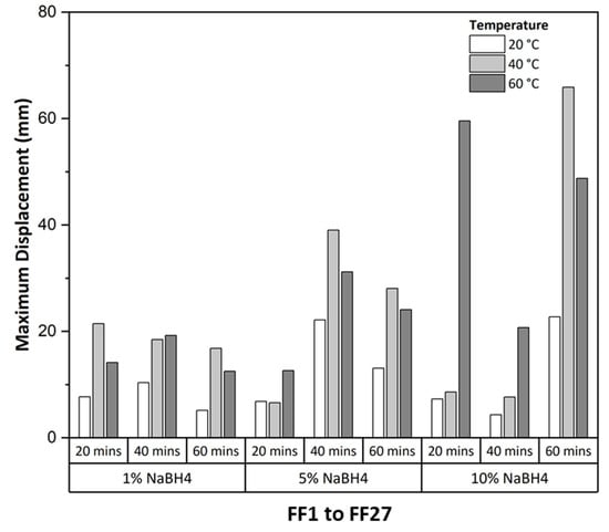 IPMC performance is typically quantified through two metrics: maximum displacement and maximum blocking force under voltage loading. The maximum displacement measured for all 27 samples are given in Figure 16. The raw data for the full factorial design, including surface resistance measurements, displacement and blocking force values, are given in Table A4. FF26 recorded the highest maximum displacement at 65.9 mm, while FF22 recorded the lowest at 22.7 mm.