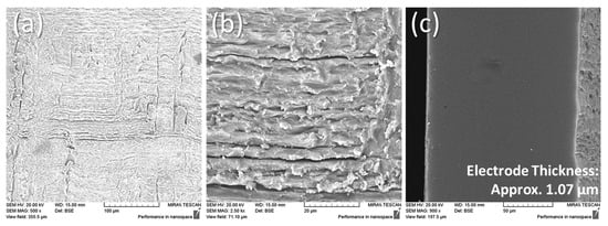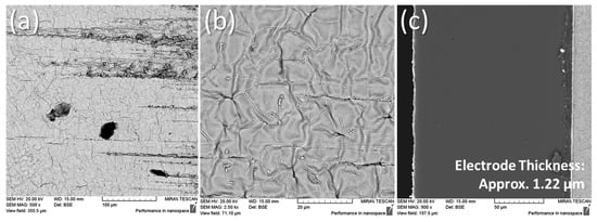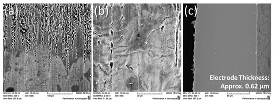 The cross-sections of the IPMC samples are given in Figure 15. Generally, it can be observed that as the reduction temperature increases, thicker electrode layers were obtained from the formation of bulky platinum polycrystals, as reported by Lee et al. [23]. The electrode infiltration into the polymer can be described as a layered electrode [26,27], as opposed to a dendritic or granular electrode infiltration exhibited by gold-type or palladium-type IPMCs, respectively [27,28].