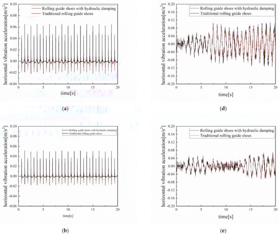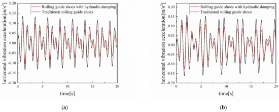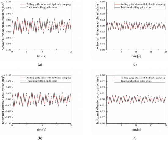 From Figure 11 and Figure 13, the maximum horizontal acceleration of rolling guide shoes with hydraulic damping and the maximum horizontal vibration acceleration of the traditional rolling guide shoes under different working conditions were taken and compared. The comparison dates obtained are shown in Table 5.