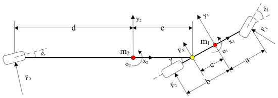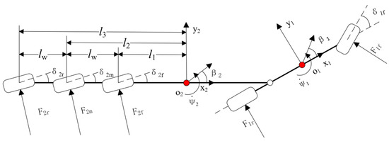 In this paper, the simplified three-DOF yaw model of tractor semitrailers will be used, and the yaw model of tractor semitrailers is shown in Figure 2. Meanwhile, the differential equations of tractor and trailer dynamics can be obtained according to Newton’s laws of motion [15].