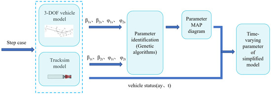 The simplified three-DOF yaw model of the tractor semitrailer was firstly established, and then the offline identification of the cornering stiffness of each axle of the tractor semitrailer was carried out by the genetic algorithm; these axles were the front axle of the tractor, the rear axle of the tractor, and the equivalent axle of the trailer, respectively. After identifying the parameters under different test conditions, the parameter MAP diagrams can be obtained, in which the independent variables are lateral acceleration and cargo mass, and finally, the time-varying parameter values can be obtained by using the look-up table method according to the real-time state of the vehicle, which can significantly improve the accuracy of the simplified model.