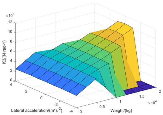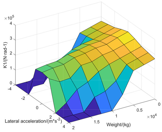 From Figure 4, it can be seen that, for the same cargo mass, the tractor front axle cornering stiffness decreases with the increase in lateral acceleration, and the change is obvious when the cargo mass is large, while the change is small when the cargo mass is small. Under the same lateral acceleration, the tractor front axle cornering stiffness decreases with the increase in cargo mass, and the change is obvious when the lateral acceleration is large, while the change is small when the lateral acceleration is small. The variation in the tractor front axle cornering stiffness is in accordance with the knowledge of automobile theory, that is, with the increase in lateral acceleration, the load transfer rate will increase accordingly, which leads to the decrease in the cornering stiffness [17].