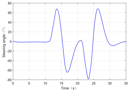 In order to verify the accuracy of the model after parameter identification, the double lane change test condition is chosen to compare the simplified model and Trucksim model, where the double lane change condition refers to the test condition with an initial speed of 50 km/h and a road adhesion coefficient of 0.85, and the mass of the cargo loaded in the test condition is 5000 kg, which can be a better comparison for the accuracy of the model after parameter identification. The results are shown in the figure below. The validation results are shown in the following figures, in which Figure 7 shows the steering wheel angle, and Figure 8 shows the comparison of the responses of the tractor and trailer under the simplified model and Trucksim model.