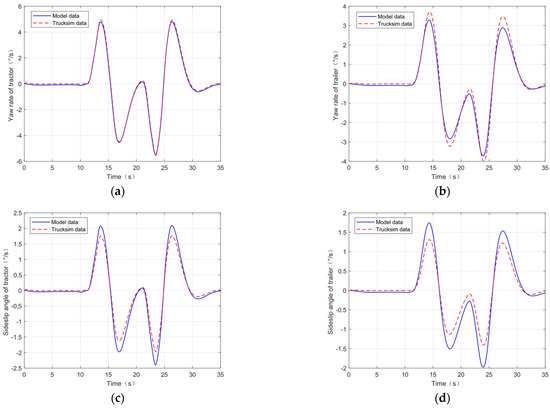 Response comparison under the double lane condition of the simplified model and Trucksim model. (a) Yaw rate of the tractor; (b) yaw rate of the trailer; (c) sideslip angle at the CG of the tractor; and (d) sideslip angle at the CG of the trailer.
