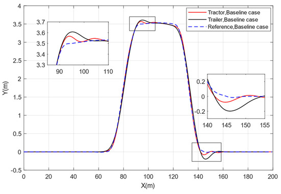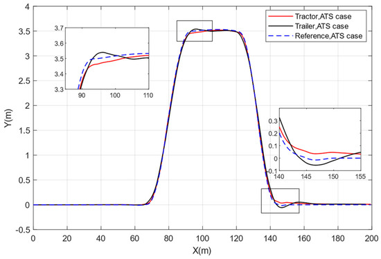 Figure 11 shows the tractor and trailer trajectories of a traditional tractor semitrailer without active trailer steering control, and Figure 12 shows the tractor and trailer trajectories of a tractor semitrailer with active trailer steering. As can be seen from the figure, compared with the traditional tractor semitrailer, both the tractor and trailer sections of the tractor semitrailer with active trailer steering control can track the reference trajectory better. Compared to the uncontrolled results, the tractor part does not show any overshooting of the trajectory, while the overshooting of the trailer’s trajectory is significantly optimized, which means that the trailer part will have less encroachment on the lateral space of the roadway during lane change process. Combining Figure 11 and Figure 12 with Table 3, it can be seen that the maximum tracking deviation of the trailer was improved by 53.49% and 71.55%, respectively, at the two obvious overshooting phenomena.