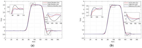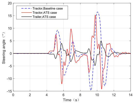 In order to verify the effectiveness of the proposed active trailer steering control strategy based on LQR, this was tested under a double lane change condition and compared with the traditional tractor semitrailer without active trailer steering control, where the test conditions of the traditional tractor semitrailer without active trailer steering control are called the baseline case, shown by dashed lines, and the test conditions of the tractor semitrailer with active trailer steering are called the ATS case, shown by solid lines. The double lane change condition refers to the condition with an initial speed of 60 km/h, a lateral offset of 3.5 m, and a pavement adhesion coefficient of 0.85.