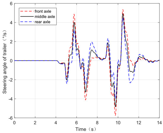 Figure 14 shows the distribution of trailer axle cornering angles for the tractor semitrailer with active trailer steering. The equivalent cornering angle is the trailer middle axle cornering angle, with the front axle cornering angle of the trailer being larger than the middle axle, and the rear axle cornering angle of the trailer being smaller than the middle axle.
