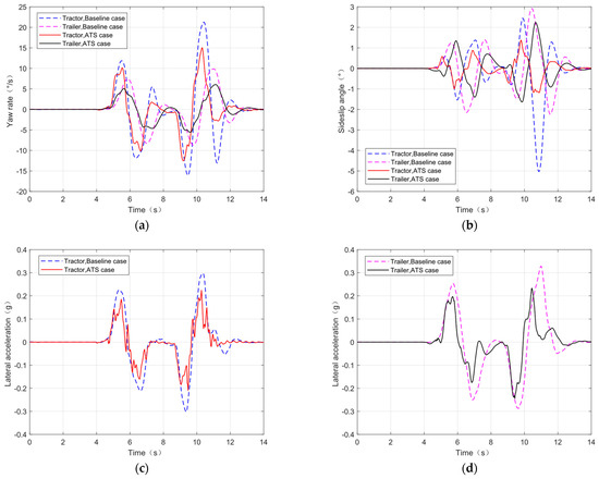 Comparison of lateral stability indicators. (a) Yaw rate of tractor and trailer; (b) sideslip angle at the CG of the tractor and trailer; (c) lateral acceleration of the tractor; and (d) lateral acceleration of the trailer.