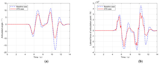 Figure 16a shows the comparison of the variation in the articulated angle between the tractor and trailer in the two cases. From the figure, it can be seen that, compared with the traditional tractor semitrailer without active trailer steering, the articulated angle of the tractor semitrailer with active trailer steering is obviously smaller, and the maximal articulated angle is reduced by 45.56%, and the larger change of the articulated angle means that it is easier for accidents such as collapsing to occur [18]. Figure 16b shows the comparison of the lateral force at the articulation point between the tractor and the trailer in the two cases, the maximum lateral force is reduced by 30.66%, and the lateral force at the articulation point is significantly reduced, which means that in the process of changing lanes, the trailer will interfere less with the lateral force on the tractor, which is very important for the improvement of the lateral stability of the tractor semitrailer [19]. Meanwhile not only at the maximum values, but also at each peak, both parameters are significantly improved, meaning that stability problems caused by the articulation can be significantly optimized during lane change.