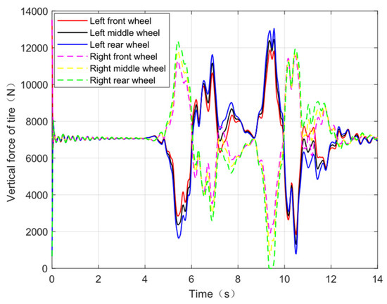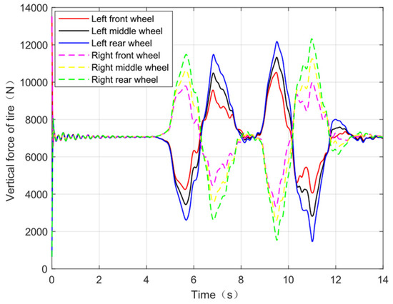 In addition, Figure 17 and Figure 18 show the distribution of vertical wheel forces on each axle of the trailer without active trailer steering and with active trailer steering, respectively. Load transfer LTR is often used to measure the stability of tractor semitrailers [20], and this is the ratio of the difference between the vertical load on the wheels on both sides to the sum of the vertical loads, as shown in Equation (23):