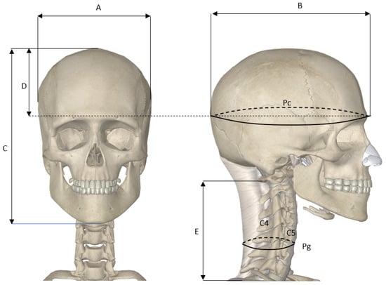 The human head weighs approximately 5 kg and is supported by the seven neck vertebrae and the approximately 20 muscles that are responsible for moving the head and holding its weight. According to an anthropometric study carried out in the US, the average circumference of the human head is estimated at 57 cm in males and 55 cm in females [17]. Another study conducted by Newcastle University in the UK shows the average circumference of the human head at 57.2 cm in males and 55.2 cm in females, respectively, with the average dimension varying proportionally to the individual’s height [18].