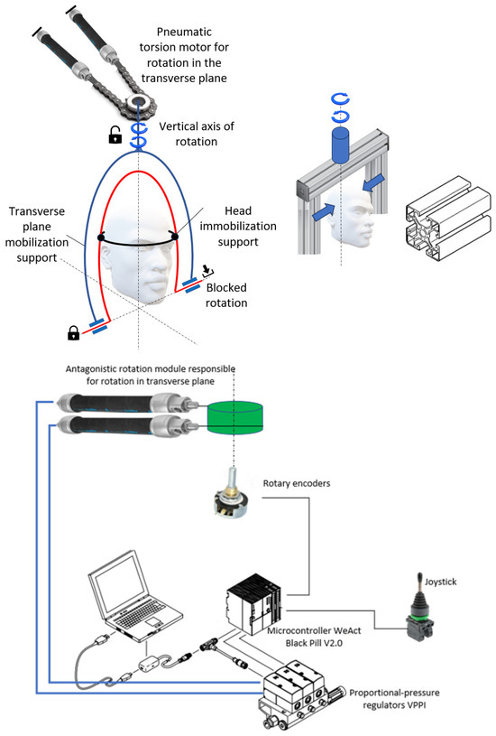 The patient’s head is immobilized in a cylindrical support and is rotated together with this support on a vertical axis. The diameter of the cylindrical support is adjustable and thus allows for the mobilization of the neck joint of patients with different dimensions of their heads. The entire mechanical structure will be built from light aluminum profiles.