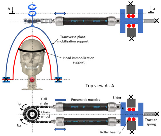 The free ends of the two pneumatic muscles are attached to a Gall chain that runs over a chain wheel. The rotation of the wheel in one or the other direction generates the motion of the mobile assembly designed for the transverse rehabilitation of the neck joint.