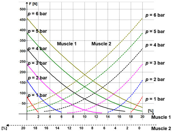 MuscleSim v. 2.0.1.5 software developed by Festo provides for these muscles the values of the developed forces versus feed pressure and specific axial contraction. The data provided by the software are used to plot the variation graphs of the forces developed by the two antagonistic muscles versus compressed air pressure and specific axial contraction (Figure 6).