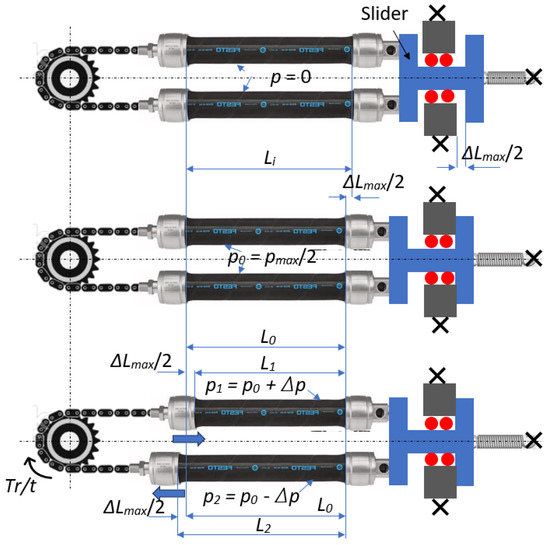 In order to rotate the chain wheel in the opposite direction, the two muscles will be charged as follows: the first muscle relaxes under a pressure of p1 = p0 − Δp and the second muscle contracts under the action of a pressure of p2 = p0 + Δp.