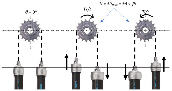 Table 2 shows the angles at equilibrium of the chain wheel axle for several (p1; p2) sets of values, with p1 and p2 varying antagonistically between 0 and 6 bar: