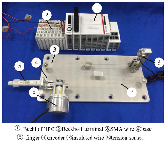 After verifying the proposed ANFTSMC algorithm, we designed a prosthetic hand robot system based on the SMA actuator, as shown in Figure 15. This dexterous hand robot consists of five fingers, and each finger is controlled by an individual SMA actuator. The SMA actuators are installed in the forearm. In order to enhance control over the SMA wire, a displacement feedback mechanism has been established. The controller is a Beckhoff industrial personal computer, and analog communication is conducted through the Beckhoff terminal module. The sample frequency is set to 200 Hz. To prevent overheating of the SMA actuator, the maximum input current value is set to 0.4 A.