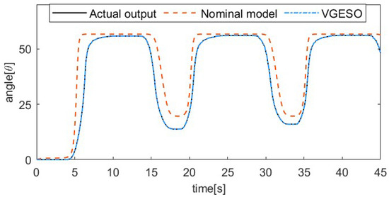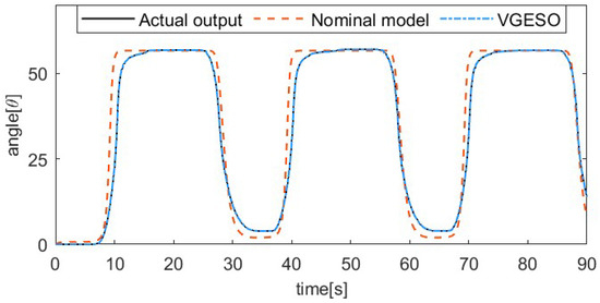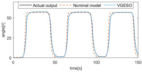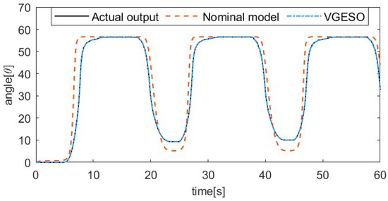 Comparative result among the actual output, nominal model, and VGESO at f = 1/15 Hz.