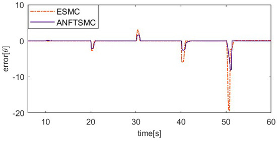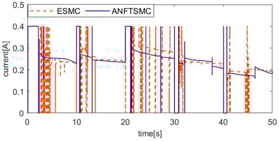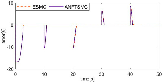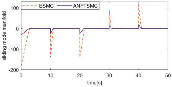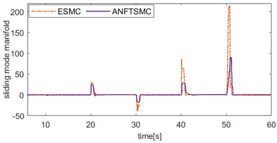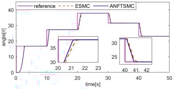 Figure 7, Figure 8, Figure 9 and Figure 10 show the comparative results between the ANFTSMC scheme and the ESMC scheme. Specifically, Figure 7 depicts the multi-step tracking trajectory. Figure 8 illustrates the corresponding tracking error. Figure 9 displays the control input for the two schemes. Figure 10 shows the performance of the sliding mode manifold. It is evident that both schemes can track multi-step trajectories. However, the proposed ANFTSMC scheme exhibits a faster convergence rate during value increases and decreases. This indicates that the ANFTSMC scheme can more quickly compensate for the total disturbances during the transition between martensite and austenite. It can be observed that the proposed scheme effectively reduces chattering compared to the ESMC scheme. This further demonstrates that the ANFTSMC method possesses strong capabilities to estimate the total disturbance in real time. Furthermore, Figure 10 shows that the proposed method enables the system states to converge more quickly to the equilibrium position.