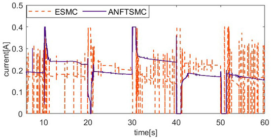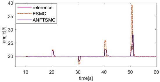 The load factor can affect the dynamic properties of the SMA prosthetic finger, as different loads can result in different hysteresis loops. To verify the ability of the proposed method to resist varying load disturbances, the system applies an additional 50 g load to the fingertip after the 10th second during the 20° setting value tracking experiment, unloads the 50 g load at the 20th second, applies a 150 g load at the 30th second, and then unloads the 150 g load at the 40th second. To further verify the robustness of the control system, an external pulse disturbance is applied to the system during the tracking of the setting value. To ensure load consistency, the coupling is rotated 15° counterclockwise at the 50th second, enabling the alloy wire to achieve temporary relaxation. Figure 11, Figure 12, Figure 13 and Figure 14 show the setting value tracking trajectory experiments with load disturbances. Figure 11 and Figure 12 demonstrate the ability of the two schemes to reject load disturbances. It can be seen that the ANFTSMC scheme can quickly converge to the reference trajectory under the condition of increasing or decreasing loads, with small errors and strong disturbance rejection ability. However, while the ESMC scheme can ensure the system’s stability, the tracking error is larger. The external pulse disturbance error of the ESMC scheme is 19.21°, which is more than twice as large as that of the ANFTSMC scheme (8.19°). Figure 13 shows the control input, and it is obvious that the proposed ANFTSMC scheme exhibits less chattering than the ESMC scheme. Furthermore, from Figure 14, it can be further observed that the ANFTSMC scheme has greater robustness.