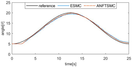 The sinusoidal response comparison curve and error comparison curve of the two algorithms are shown in Figure 16 and Figure 17. The reference signal is . Because the pre-tension affects the dynamic characteristics of SMA, the index finger is pre-tightened in this part of the tracking experiment, with an initial bending angle of 5°. From Figure 16 and Figure 17, we can find that the proposed ANFTSMC algorithm can compensate for the change in dynamic characteristics, having a smaller steady-state error and less chattering. Only considering the steady state of the system, the maximum absolute error of the ESMC is 1.03° and the maximum absolute error of the ANFTSMC is 0.63°. Therefore, the tracking performance of the ANFTSMC is better.