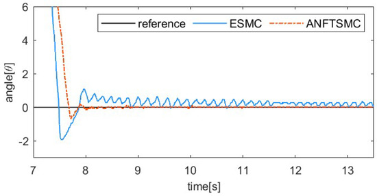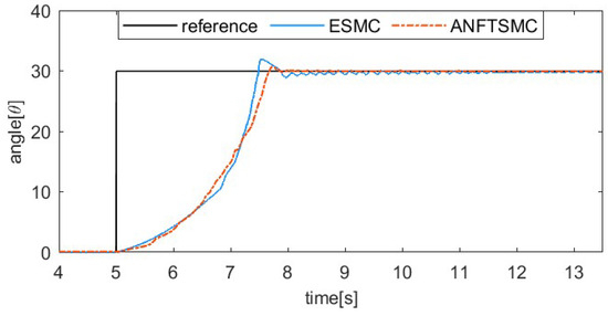 The step signal tracking comparative curves are displayed in Figure 18 and Figure 19. From the experimental results, it can be observed that the proposed ANFTSMC algorithm exhibits a small overshoot value, specifically 0.59°. In contrast, the overshoot value of the ESMC algorithm is 1.19°. Meanwhile, when the system reaches a stable state, the proposed ANFTSMC algorithm ensures stability with minimal chattering or vibration. However, the ESMC algorithm experiences continuous chattering. Therefore, the prosthetic hand robot system demonstrates superior control performance when using the ANFTSMC algorithm.