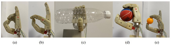 To evaluate the flexibility and grasping capabilities of the SMA-actuated prosthetic hand robot, experiments focusing on typical activities of daily living were carried out in this part. According to the different objects grasped, the grip patterns are classified into power grip, precision grip, and lateral grip [41]. Due to the structural limitations of the prosthetic hand used in this study, lateral grip experiments are not included as part of the experimental content in this paper. We conducted tests and experiments with various commonly used postures in daily living, along with 50 grasps of multiple types of items, achieving a grasping success rate of over 95%. In Figure 20, we display the pointing posture, OK posture, cylindrical grip, spherical grip, and precision grip from left to right. The pointing posture is a frequently used action in daily living, such as pressing a switch, while the OK posture expresses agreement. The cylindrical grip and spherical grip belong to power grips. The diameters of the cylinder and the sphere are 6.3 cm and 6 cm, respectively. The object intended for precision grip is a standard competition-grade table tennis ball. As shown, the prosthetic hand is capable of performing different hand gesture movements and achieving stable grasping of different objects. Therefore, the effectiveness of the proposed ANFTSMC algorithm is further confirmed.