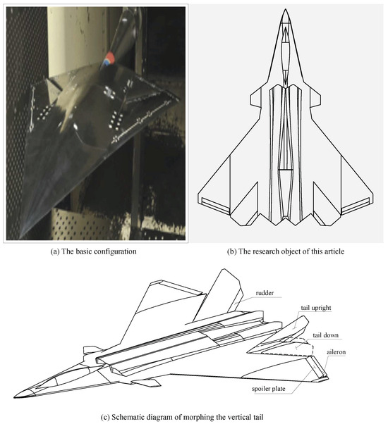 The prototype of the morphing airplane studied in this paper is shown in Figure 1a [10]. This aircraft features a large sweep-angle diamond wing, which is advantageous for reducing shock wave drag and enhancing supersonic performance. In this paper, its configuration is further refined and updated to Figure 1b. When the tail is fully retracted, the aircraft is a tail-less stealth configuration; when the tail is fully deployed, it is a tailed maneuvering configuration. The vertical tail deformation diagram is shown in Figure 1c. The basic parameters of the morphing tail aircraft are shown in Table 1.