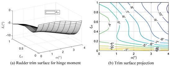 The rudder angle for balancing the hinge moment is calculated at different angles of attack and deformation coefficients; the trim surface obtained is shown in Figure 5a. By projecting this surface onto a plane with as the horizontal axis and as the vertical axis, the numerical relationship between the rudder trim angle with and can be obtained (Figure 5b). Figure 5b shows that the increase in the or leads to an increase in the rudder trim angle. In the entire process, the maximum rudder trim angle reaches , which is approximately 33% of the maximum rudder angle (). This result shows that within the allowable range, the rudder can be used in conjunction with the variable tail to counteract the hinge moment, thereby reducing the demand for the variable vertical tail drive motor.