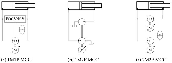 In an MCC, electric servo motor(s) driving fixed-displacement hydraulic pump(s) are used. The motion of the hydraulic cylinder is controlled by manipulating the electric servo motor velocities. MCCs can be categorized into various topologies based on the number of electric servo motors and hydraulic pumps employed [5]. The main topologies include one-motor-one-pump (1M1P), one-motor-two-pump (1M2P), and two-motor-two-pump (2M2P) MCCs, as illustrated in Figure 1.