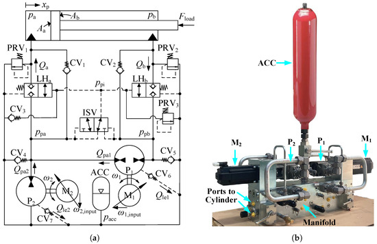 The inherent limitations of 1M1P and 1M2P MCCs can be effectively mitigated in a 2M2P MCC. This system directly manages the cylinder differential flow by employing a secondary hydraulic pump driven by a secondary electric servo motor. This approach eliminates the requirement for two POCVs or an ISV, thereby removing pump mode oscillations [19]. With the utilization of two electric servo motors, which offer two degrees of control freedom, 2M2P MCCs do not require a strict matching of pump displacements to the cylinder area ratio. Furthermore, these two control degrees enable simultaneous control of both the cylinder position and pressure, making 2M2P MCC an attractive option for applications such as injection molding machines [20,21,22] and knuckle boom cranes [23,24].