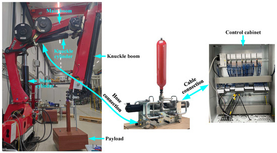 Experimental setup: a knuckle boom crane, a 2M2P MCC prototype, and a control cabinet.