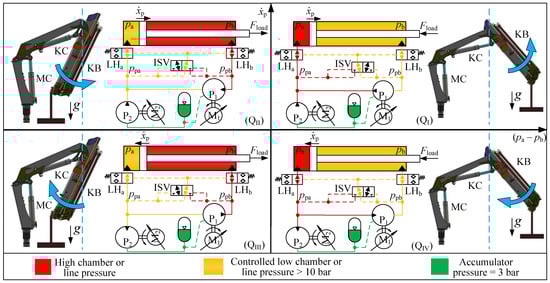 In Figure 5, the status and motions of all components when the load-holding function is activated in all four quadrants are depicted. The blue color represents the low chamber or line pressure. As the load-holding valve cracking pressure is set at 10 bar, the pressure marked in blue is lower than 10 bar but higher than the accumulator pressure. The system status and component motions exhibit distinct similarities when the load-holding function is engaged in both and , as well as in and .