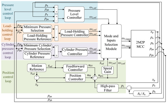 The control algorithm, originally proposed for 2M2P MCCs in [24], is employed in this study. This control algorithm is depicted in Figure 6. It comprises four distinct control loops, namely the position control loop, cylinder pressure control loop, load-holding control loop, and pressure level control loop. The outputs from these four control loops are strategically selected by the mode and inputs selection module in accordance with the explanations in Section 3.