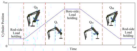Consequently, the load-holding function activated in and is denoted as bore-side load holding, while that in and is referred to as rod-side load holding. It should be noted that in the figure only represents the piston velocity before the load-holding function is triggered.
