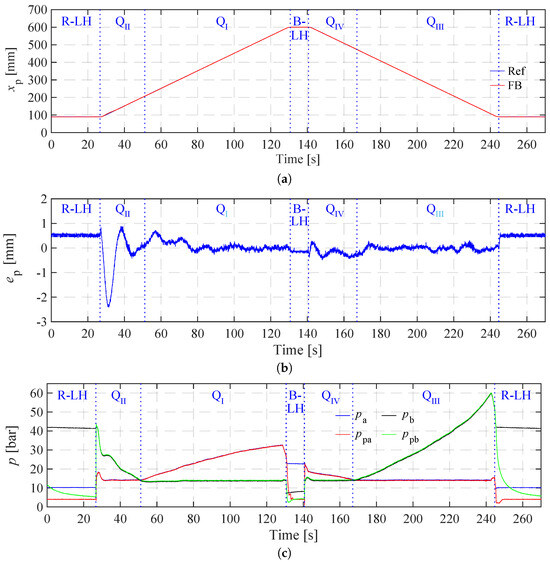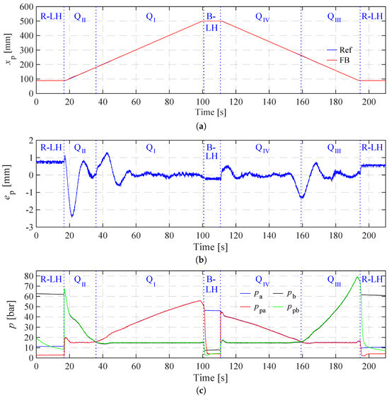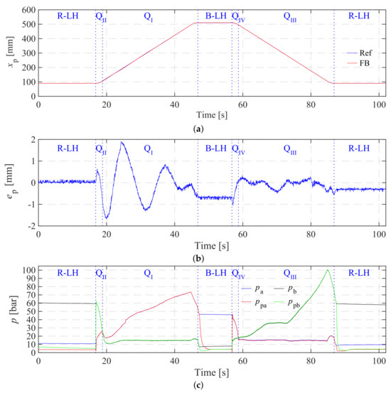 Three distinct cases are considered in the experiment to thoroughly validate the four-quadrant operation and load-holding function of the proposed system. These three cases are described in Table 3. It should be noted that the prototype approaches its peak power limit in case three. The cylinder position reference signals in different cases, following the general rule illustrated in Figure 7, exhibit variations in stroke length and experiment time. The results described in the following subsections comprise the position reference (Ref) and feedback (FB), the position error, and the system pressures. In the figures, the light blue dotted lines separate different quadrants and load-holding periods. , , , and denote the first to fourth quadrants, respectively. The rod-side load holding and bore-side load holding are abbreviated as R-LH and B-LH, respectively.