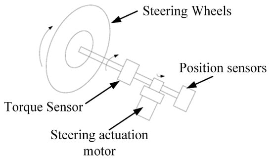 In Equation (4), is steering wheel angle, is motor angle, is steering wheel moment of inertia, is the damping coefficient of the steering column, is input torque from the driver, is torsional stiffness of the steering column, is the damping coefficient of the motor, and is transmission ratio from the motor to the steering column.