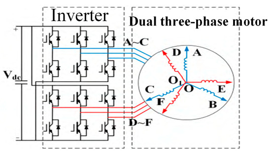 Structural diagram of dual three-phase permanent magnet synchronous motor, A~C and D~F are motor windings, is the power supply and , are the two sets of motor winding neutral point.