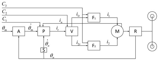 Dual three-phase SBW system redundant control. A: Dual three-phase SBW acceleration module. P: Regulators for speed loop and current loop. V: Torque-balancing output module for dual three-phase motors. f1, f2: Space–vector pulse-width modulation (SVPWM) modules. M: Dual three-phase permanent magnet synchronous motors. R: Steering executive mechanism. C1, C2, C3: System downgrade signals. : Target steering angle. : Actual steering angle. : Target rotational speed of the steering executive motor. : Actual rotational speed. : Actual motor current. : Target torque output current. , : Current signals. , : Drive modules.
