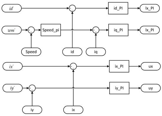 In Figure 8, speed_pi represents the PI regulator for the speed loop, while ld, lq, lx, and ly denote the PI regulators for the D-axis, Q-axis, X-axis, and Y-axis of the dual three-phase permanent magnet synchronous motor. The target values for these regulators are represented by ld*, wm*, lx*, and ly*, with ud, uq, ux, and uy indicating the output values.