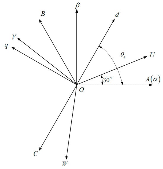 The VSD coordinate transformation approach is employed to map the variables of a dual three-phase permanent magnet synchronous motor onto three distinct, mutually orthogonal subspaces: the subspace, the subspace (harmonic components), and the zero-sequence subspace. For analytical simplicity, a dual three-phase permanent magnet synchronous motor is modeled as an ideal motor under the following assumptions: (1) Stator currents and air-gap flux produced by the rotor’s permanent magnets are sinusoidally distributed; (2) Mutual inductance coefficients associated with leakage flux are neglected; (3) Eddy current losses are disregarded; (4) Hysteresis losses of the permanent magnets are omitted; (5) Magnetic saturation effect in the rotor core is ignored; (6) No damping windings are installed on the motor rotor.