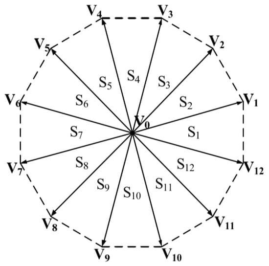 In the first step of the two-step vector synthesis method, to maximize utilization rate of the bus voltage, vectors from Groups L1 and L2 with the same direction on the plane are selected to synthesize a harmonic-free vector. With the constraint of zero volt-second equivalent voltage on the plane, 12 non-zero harmonic-free vectors are synthesized on the plane, as shown in Figure 11. These 12 harmonic-free vectors divide the plane into 12 sectors, S1–S12. For example, Vector 9 of Group L1 and Vector 43 of Group L2 combine to form a harmonic-free vector V1. According to Table 1, during synthesis of a harmonic-free vector, the duty-cycle ratio coefficients PL1 and PL2 for the vectors from Groups L1 and L2 have specific constraint relationships: