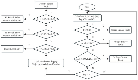Current sensor faults, phase loss faults, and open-circuit faults in switch tubes all lead to changes in the linear characteristics in the plane current trajectories. At the same time, there are differences in slope and symmetry of the plane current trajectories under these three types of faults. Commonality in the plane current trajectories under these conditions serves as the premise for synchronous diagnosis, while differences in the current trajectories create opportunities for identifying specific faults. To optimize the diagnostic process, this paper proposes a three-step diagnostic method based on analysis of the plane current trajectories for simultaneous diagnosis of these three types of faults, as shown in Figure 18.
