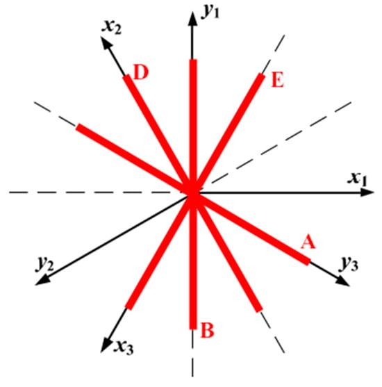 The second step in comprehensive diagnosis is to identify the axis on which the plane current trajectories reside during a fault. This is achieved by comparing the currents projected onto the coordinate axes of the plane. To facilitate fault analysis and diagnosis, three sets of orthogonal coordinate systems, each separated by 120°, have been established on the plane: , , and , as illustrated in Figure 19, Figure 20 and Figure 21. By coordinate transformation, the current components projected onto the six coordinate axes of the plane can be derived and expressed as:
