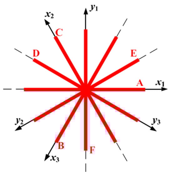 Current trajectories on the plane under various phase-loss conditions. Orthogonal coordinate systems , , and . A–F represent phase loss faults in phases A–F.