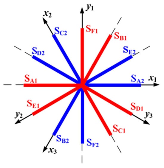 Contrasting with traditional permanent magnet synchronous motor drive systems, the dual three-phase permanent magnet synchronous motor drive system offers a larger array of voltage vectors and higher modulation complexity. Integrating spatial distribution of the six-phase drive bridge arms of the dual three-phase permanent magnet synchronous motor with the coordinate transformation matrix from Equation (17), the spatial voltage vectors generated by the two-level six-phase inverter in the and planes are represented as follows: