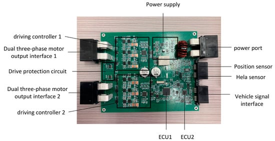 To verify safety and reliability of the dual-redundancy SBW control system’s steering execution, initial comprehensive laboratory performance tests of the automotive steering gear were conducted to ascertain feasibility. Subsequently, a SBW test rig was assembled to simulate the dual-redundancy SBW system under real road conditions, performing redundancy control hardware-in-the-loop tests during dual-lane-change maneuvers and simulating motor winding circuit faults during steering execution processes to assess system degradation and fault-tolerance control. The constructed drive controller is depicted in Figure 17.