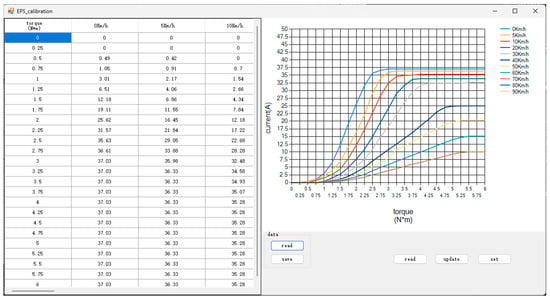Utilizing the comprehensive automotive steering laboratory performance test rig in Figure 22, input torque/motor current characteristics tests were conducted on the dual-redundancy SBW system. Tests were performed at vehicle speeds of 0 Km, 5 Km/h, 10 Km/h, 20 Km/h, and 30 Km/h~90 Km/h, applying steering wheel torque inputs of 0 to 6 N*m to assess the current outputs of the dual three-phase steering actuator motor, thereby validating the SBW system’s redundancy function. The test results are presented in Figure 23.