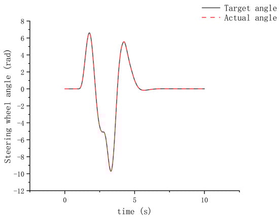 The experiment was conducted on the test rig according to the experimental principle shown in Figure 25, using a combined simulation with Simulink and Carsim. The vehicle was driven at a constant speed of 80 km/h, following the dual-lane-change trajectory depicted in Figure 26. The results are shown in Figure 27 and Figure 28, which display the vehicle’s steering wheel angle over time and the torque current output of the dual three-phase motors over time, respectively. Figure 27 indicates that the torque vector-space-decoupling control method for the dual three-phase motors balanced the output torque of the two winding sets, which were identical, resulting in equal torque outputs from both sets. When torque output of the dual three-phase motors’ winding sets becomes unbalanced to the point of being opposite, torque interference occurs. The torque vector-space-decoupling control method proposed in this paper spatially decouples the two winding sets to prevent occurrence of torque interference between dual winding sets. Additionally, the torque current output curve of the dual three-phase motors shown in Figure 28 fit well with the target current curve, and the curve was smooth, indicating that the dual-redundancy SBW system had good follow-up performance, and the redundancy function was executed without lag.