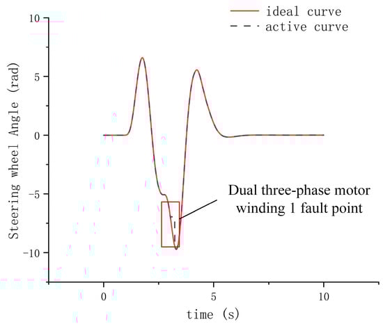 Since the dual-redundancy SBW system is designed with redundancy theory, it is equipped with fault-tolerance capabilities. This allows the steering system to continue operating even when a fault occurs, necessitating monitoring of the system’s operational status. When a fault affects one set of windings or its associated circuit within the dual three-phase motors, the system can degrade the faulty winding and perform fault-tolerant processing. The steering system continues to control the normal winding, which continues outputting torque and completing steering functions, as depicted in Figure 14.